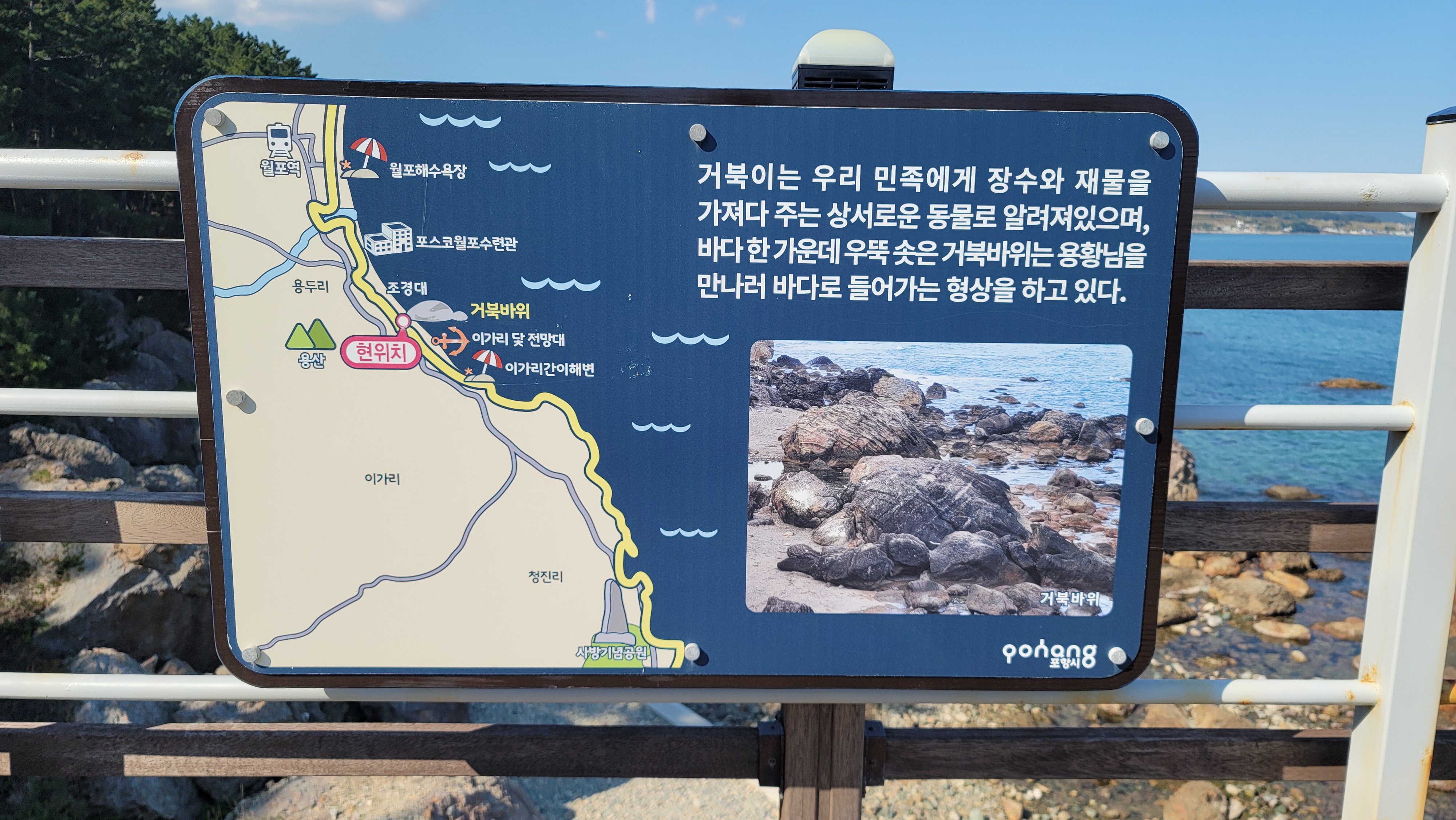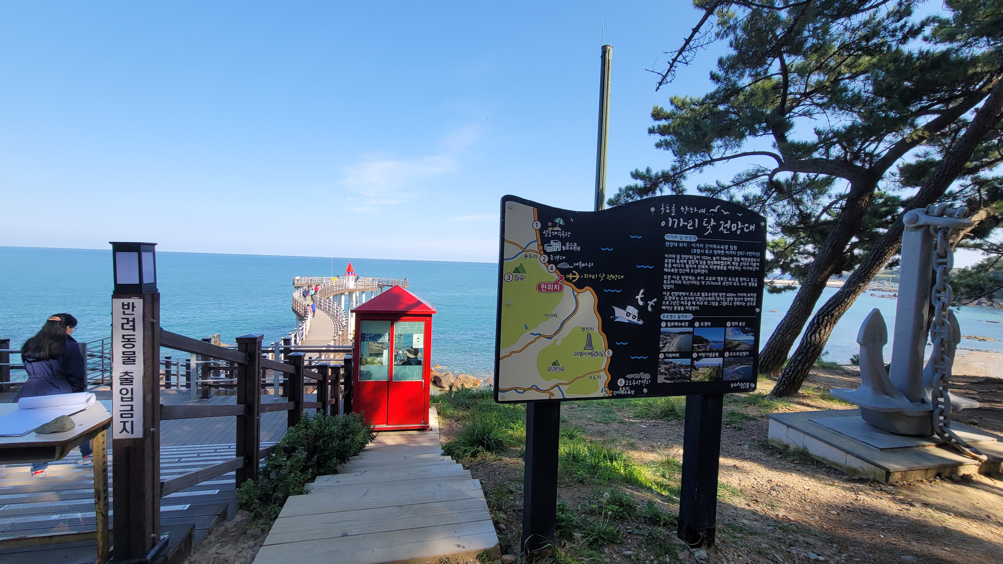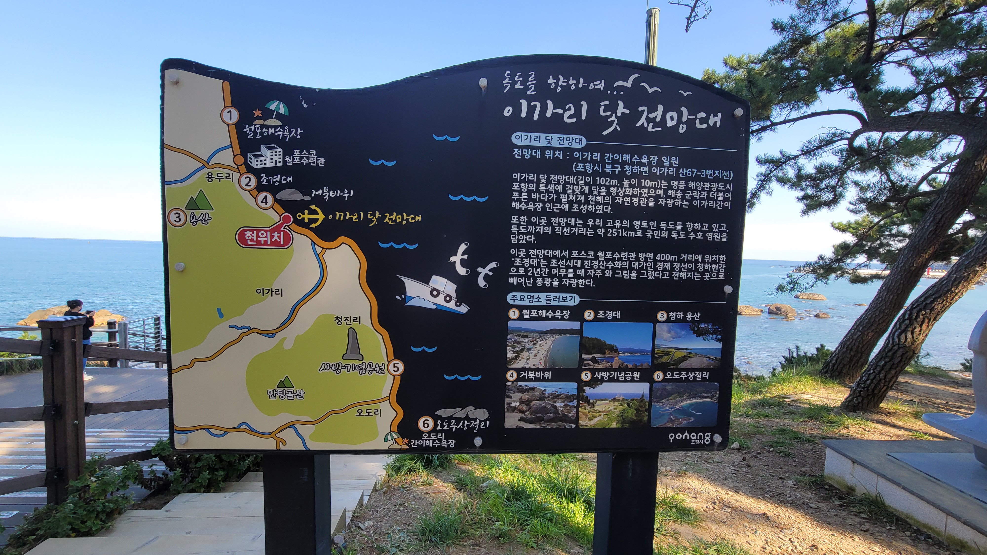 이가리 닻 전망대(길이 102m, 높이 10m)는 명품 해양관광도시 포항의 특색에 걸맞게 닿을 형상화하였으며, 해송 군락과 더불어 푸른 바다가 펼쳐져 천혜의 자연경관을 자랑하는 이가리간이 해수욕장 인근에 조성하였다. 또한 이곳 전망대는 우리 고유의 영토인 독도를 향하고 있고, 독도까지의 직선거리는 약 251km로 국민의 독도 수호 염원을 담았다. 이곳 전망대에서 포스코 월포수련관 방면 400m 거리에 위치한 '조경대'는 조선시대 진경산수화의 대가인 겸재 정선이 청하현감