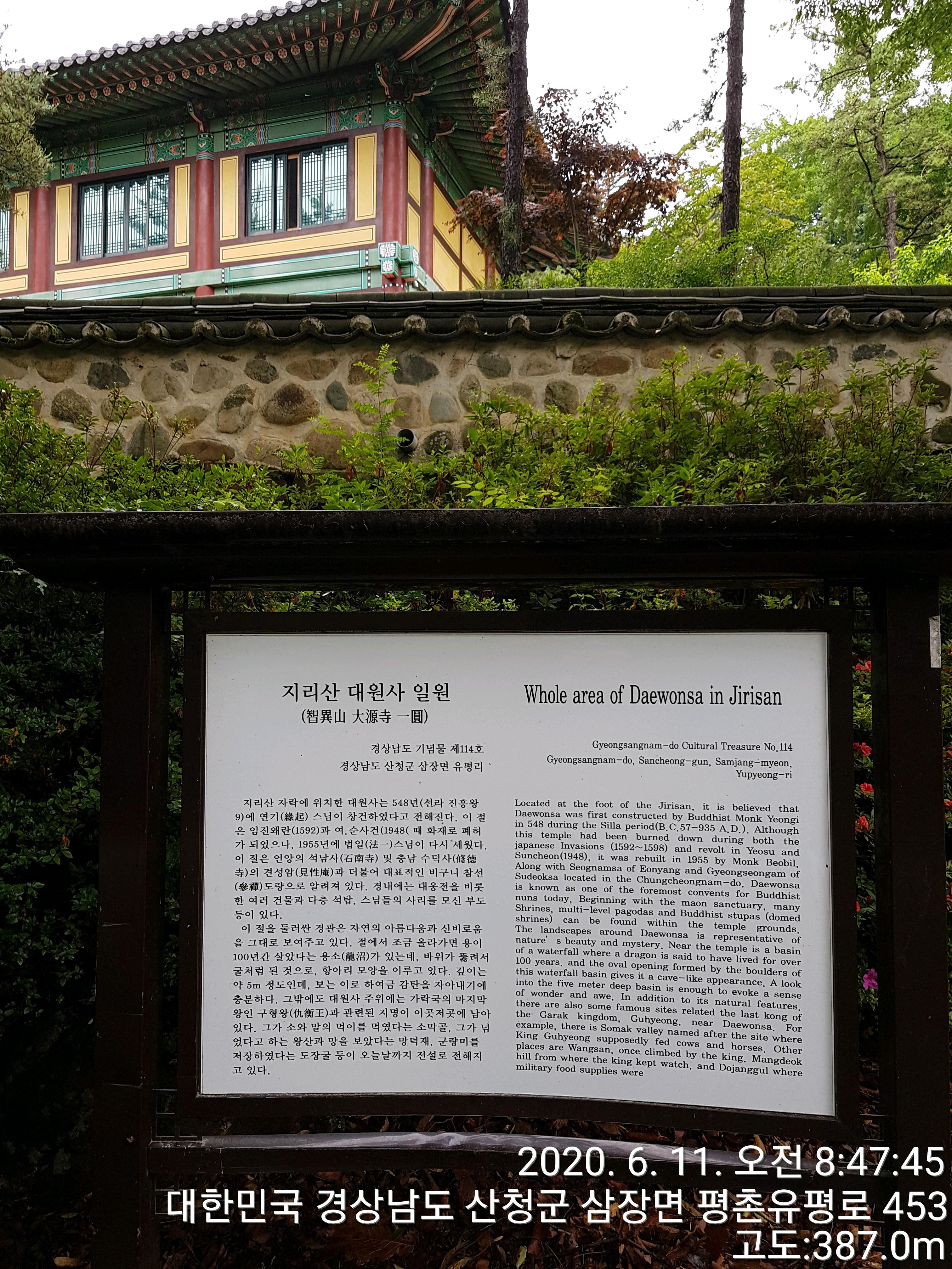 #대원사는 #지리산의 #천왕봉 동쪽 아래에 진흥왕 9년(548)에 연기조사가 창건하여 평원사라 하였습니다. 그 뒤 폐사되었던 것을 조선 숙종 11년(1685년)에 운권스님이 다시 절을 짓고 대원암이라 불렀습니다. 고종27년(1890년)에 #구봉스님이 낡은 건물들을 보수 중창하고 #대원사로 이름을 바꾸었습니다.
